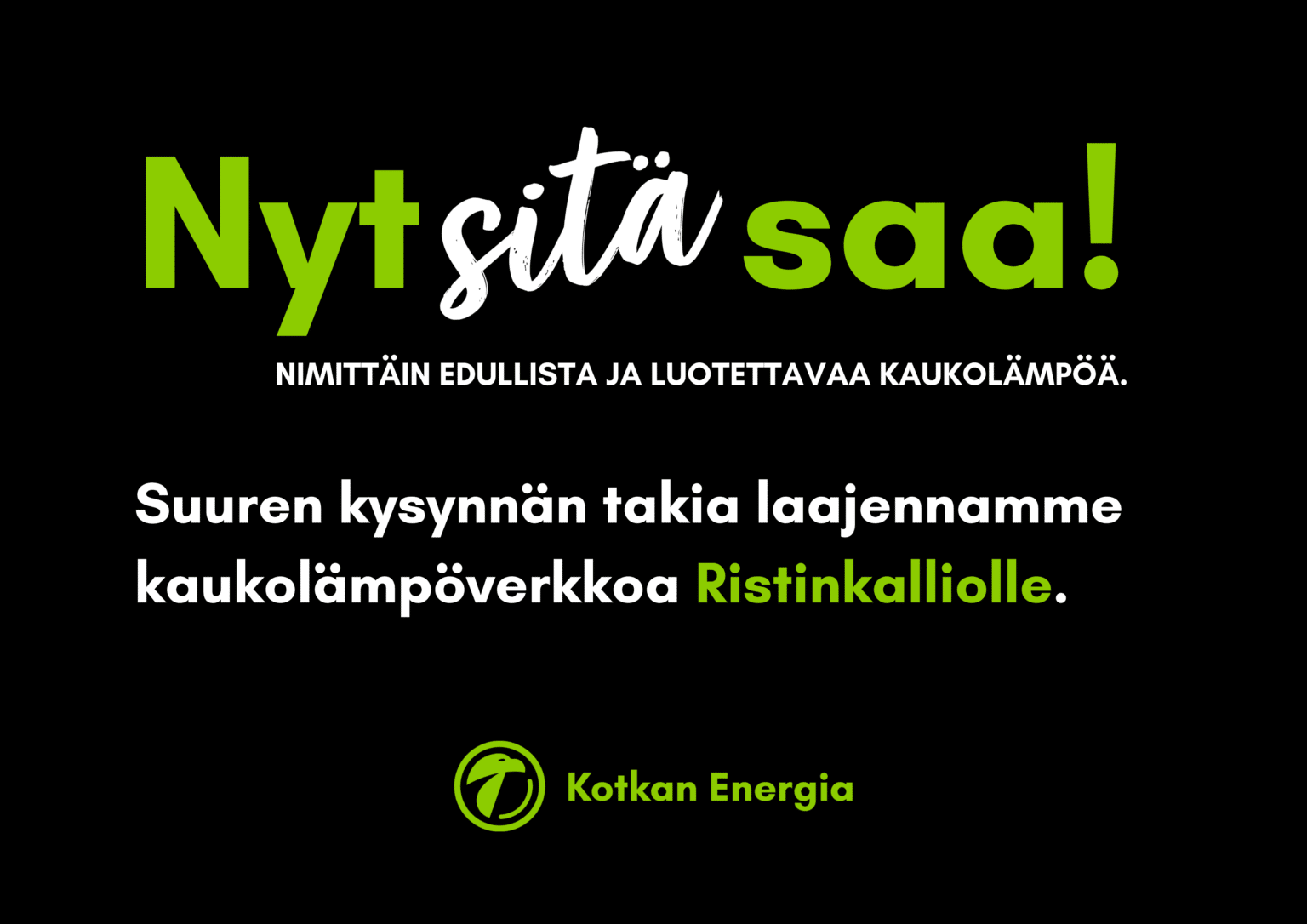 Kotkan Energia on päättänyt investoida kaukolämpöverkon laajentamiseen Ristinkallion alueelle. Investoinnin suuruus on noin 3,0 milj. euroa ja sen toteuttaminen aloitetaan välittömästi. Kaukolämpöverkon rakentamisen Ristinkalliolle odotetaan valmistuvan syksyllä 2023, jolloin ensimmäisiä alueen asiakkaita voidaan liittää kaukolämpöön.