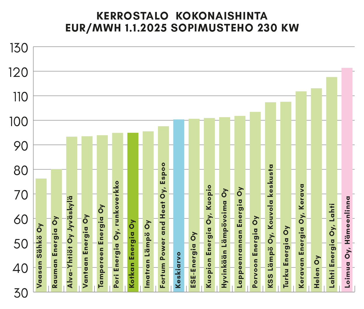 Kaukolämpöasiakkaiden määrä lisääntyy vuosittain. Ja mikä tärkeintä, Kotkan Energian kaukolämmön kokonaishinta seurattavassa asiakasryhmässä oli 5,4 % keskiarvon alapuolella (kuva 1.). Kaukolämpö on Kotkassa edullista.
