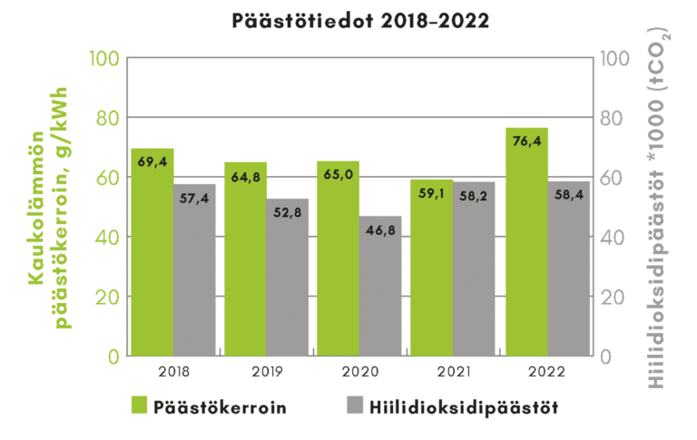 Uusien investointien myötä kaukolämmön tuottaminen onnistuu entistä pienemmillä hiilidioksidipäästöillä. Alla on kuvaaja päästötiedoista viiden vuoden ajanjaksolla. Hiilidioksidipäästöissä on raportoitu päästökaupassa mukana olevat päästöt. Kokonaispäästöt eivät juurikaan nousseet vuoteen 2021 verrattuna, mutta kaukolämmön päästökerroin kasvoi. Tuotannossa jouduttiin käyttämään enemmän fossiilisia polttoaineita (mm. turvetta) Ukrainan sodan vaikutusten takia. Kaukolämmön päästökertoimen laskennassa CHP-laitosten osalta on käytetty hyödynjakomenetelmää.